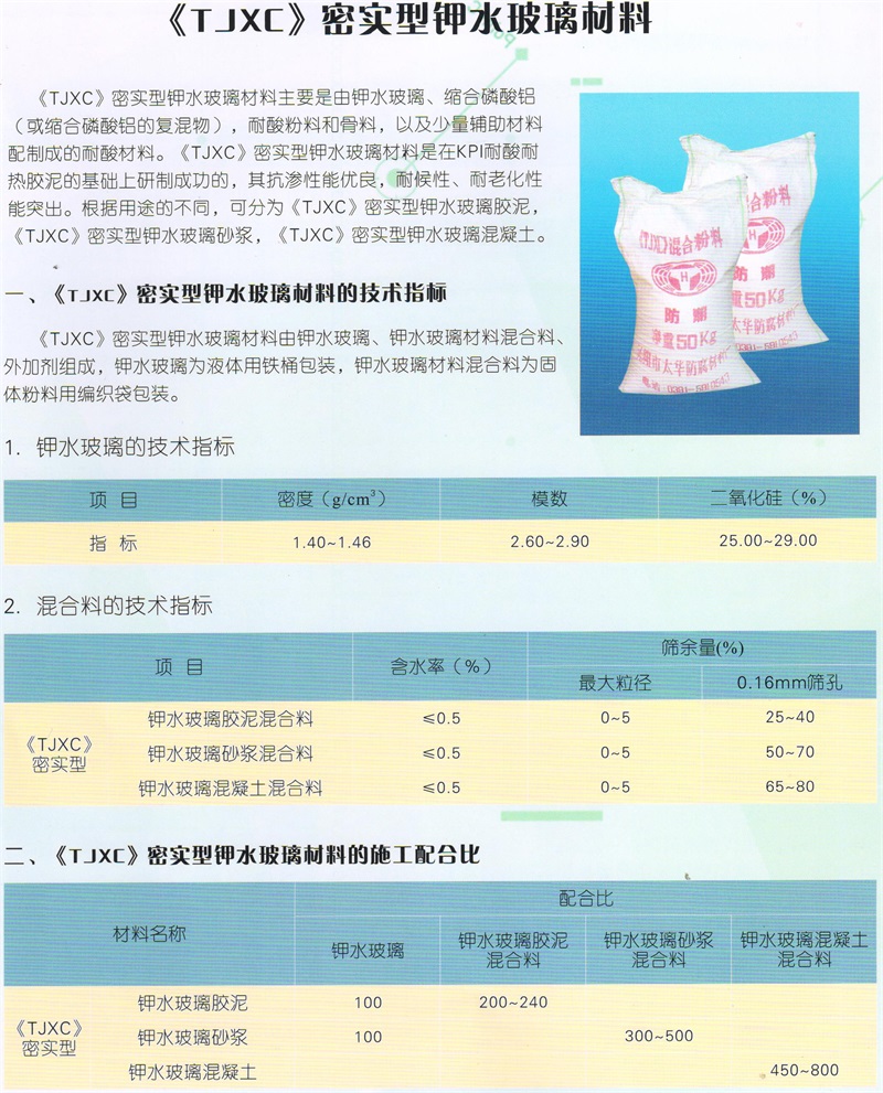 技術性能特點及用途: 《KPI》耐酸耐熱膠泥是以硅酸鉀為粘結劑,高分子縮合磷酸鹽為固化劑,硅鋁酸鹽為耐腐蝕填料組成的新型無機黏合劑。它與以硅酸納為黏合劑,氟硅酸納為固化劑的普通水玻璃膠泥相比,抗滲透性,耐熱性,耐水性等方面顯示出突出的優點。